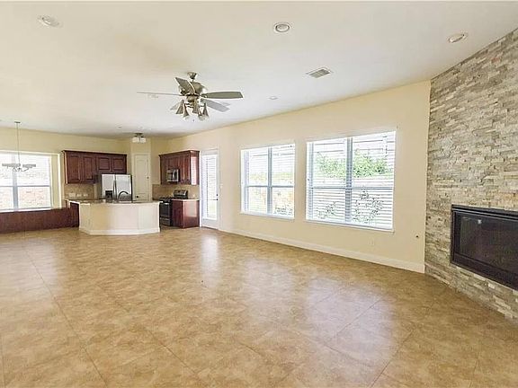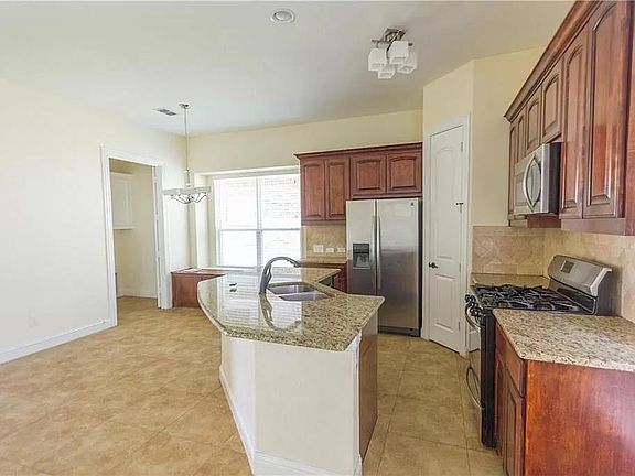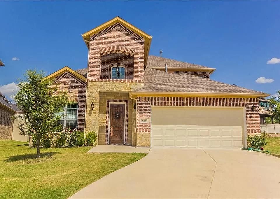 Two-story, 4-bedroom, 2.5-bath home with a flexible front dining that can serve as a second living area. The eat-in kitchen features stainless steel appliances and granite countertops, and it opens to the living room with a fireplace. The primary suite is downstairs with a large closet behind a decorative hidden door. The primary bath has a garden tub and separate shower. A separate utility room offers cabinet storage and washer-dryer hookups. Upstairs are three bedrooms with well-sized closets. Two bedrooms share a Jack-and-Jill bath with separate vanities. Convenient location near HWY 183, 161, and DFW Airport.