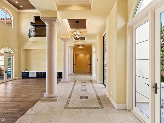 Located in the prestigious guard-gated community of Terracina in Seven Hills, this custom Tuscan-inspired estate is positioned on the Rio Secco Golf Course, it provides breathtaking views of the fairways & surrounding mountains. A grand courtyard entry with a fountain, Italian-style landscaping & custom doors leads to an open great room with real wood floor & multiple French doors that fill the space with natural light. The gourmet kitchen has marble countertops, custom cabinetry, and a bar area perfect for entertaining. A built-in DJ booth on the Juliet balcony overlooks the open great room, creating an open entertainment space. Two primary suites - one on each level. A veranda wraps around the entire back of the property and in the center is an infinity-edge pool & spa. A guest quarters with a separate entrance & kitchenette provides an ideal setup for multigenerational living or visiting guests. All 5 bedrooms are ensuite, offering privacy & luxury throughout this exceptional home.