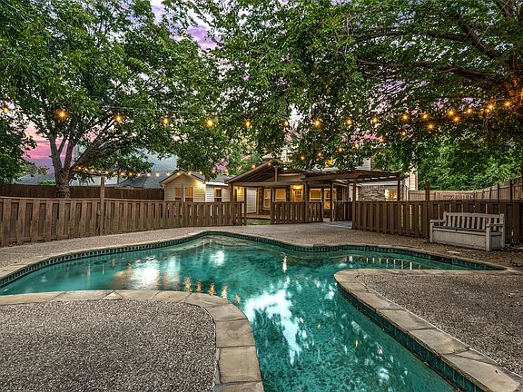 The backyard is a true Texas retreat, complete with a Texas-shaped pool, large covered porch with vaulted ceiling, and pool house for year-round entertaining.