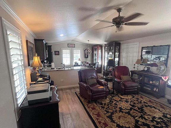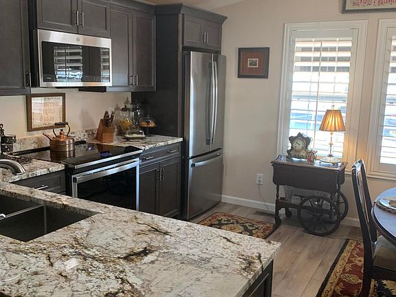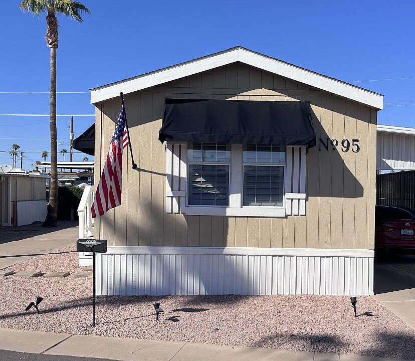 Beautiful 2-bedroom manufactured home for sale in Sunspire, a peaceful and well maintained community in Mesa! This cozy 2 bedroom, 1 bathroom manufactured home offers the perfect balance of beauty, comfort, and affordability. With 896sf of living space, the home features a spacious living room, a fully equipped kitchen, and generous storage options throughout. Recent updates include new kitchen cabinets, with 3cm granite countertops, pullouts in the kitchen cabinets, and a cutlery drawer! There are matching cabinets over the Whirlpool washer and dryer that are included. The kitchen has GE Profile stainless steel appliances, kitchen -aide disposal, and LED lighting and fixtures. All new interior paint, interior doors with Schlage hardware. New baseboards and matching door frames!!! Beautiful laminate flooring throughout this home. High end Minka-Aire ceiling fans are in each room. The bathroom was completely remodeled with new Kohler chair height toilet, beautiful new vanity with matching mirror and storage cabinet above the toilet, and a new shower door. This home also features beautiful 4inch Polywood Shutters (they will never warp,) The attached shed also has laminate flooring and built in shelves. Making this home move-in ready!! The large patio yard provides a great outdoor space for relaxing or entertaining. The community amenities include a pool, clubhouse, and pickleball courts are just steps away. Perfect for a Veteran!!!