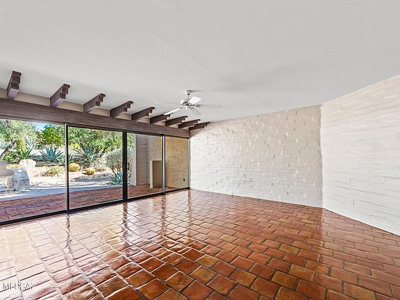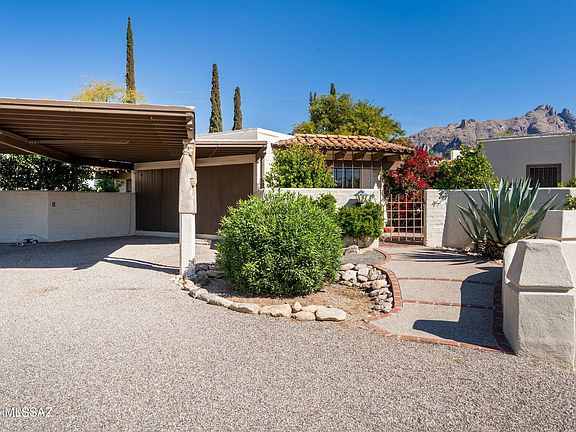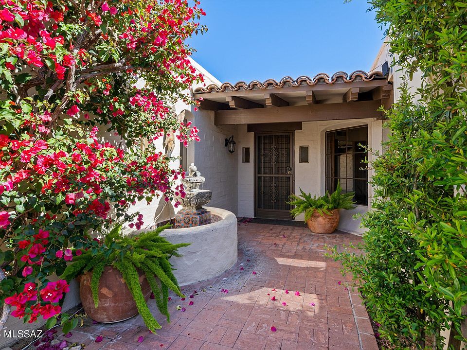 Enter into this unique National Historic masterpiece of Catalina Foothills modern Mexican Colonial architectural style of only 24 units. This is a rare opportunity to reside in this community. You will be greeted by an inviting courtyard with fruit trees, & a fountain, nestled into the Catalina Foothills. Designed by architect Juan Worner Baz in conjunction with Japanese landscape architect Taro Akutagawa, this midcentury home boasts 2 Primary suites, built-ins, 2 fireplaces, wood beams, and saltillo tile for an 'Old Pueblo warmth' . The bright kitchen has ceiling height cabinets, a double oven, a gas cooktop and access to a patio and an octagonal dining room. The spacious living room with a gas FP has double floor to ceiling patio doors that overlook the ground The primary suite has The primary suite has a fireplace, and a travertine bathroom. Enjoy the scenic patio surrounded by a community pool, Koi pond, waterfalls & 32 Cantera statues commissioned by Worder Baz adorning the enchanting grounds of this hidden treasure. If you want something with lower maintenance, historic character, this is the home for you. Be sure to see the heated pool area out your back patio. This private sanctuary lies across from La Encantada mall and offers fantastic restaurants and shopping. nearby. HOA includes building exterior including pest control, blanket insurance policy, pool, roof, common area and grounds, trash, sewer, water. (see documents) This gem won't last.