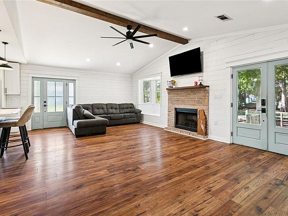 Welcome home to this beautifully renovated farmhouse-style retreat on almost an acre of land! With 3 bedrooms and 2 baths and bonus room that can be used as additional bedroom, office or for entertaining. The living room feels bright and inviting with its vaulted beamed ceiling, cozy gas fireplace, and bay window with a built-in bench - great for relaxing with a good book. The kitchen has been completely updated with shaker cabinets, quartz countertops, subway tile, a farmhouse sink, and stainless steel appliances. You'll love the details throughout, from the custom trim and wood accents to the stylish barn doors. Outside, there's a large gazebo for entertaining, a convenient circular driveway, and a 20x40 storage area for all your extras. Best of all, it's located in Flood Zone X!