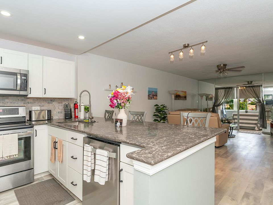 Beautifully updated and fully furnished, this 55+ 2/2 condo is truly move-in ready. The home was completely redone in 2024, including a new electrical panel, with a new HVAC and water heater installed in 2025. You'll love the open layout, the fresh flooring throughout, and the modern kitchen with stainless appliances and soft, adjustable LED lighting.The bright Florida room offers storage and opens to a private, nicely landscaped patio--a great spot to relax. The primary bedroom features a walk-in shower and a ADJUSTABLE king bed that stays with the home. A rare bonus: in-unit laundry and an assigned parking spot right at your front door.The HOA covers nearly everything except electric, all building milestones are complete. Conveniently located just off I-95 and minutes from beach.