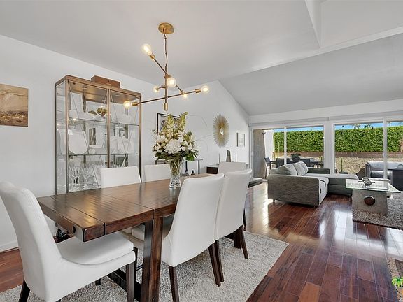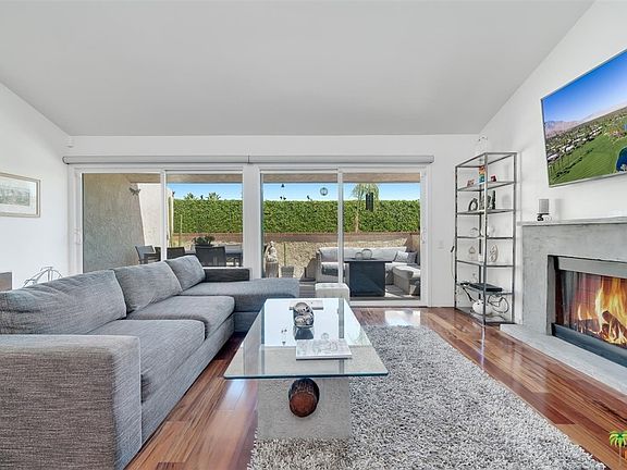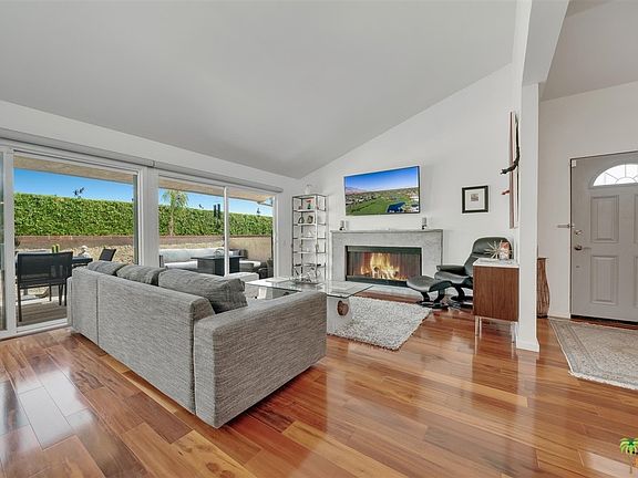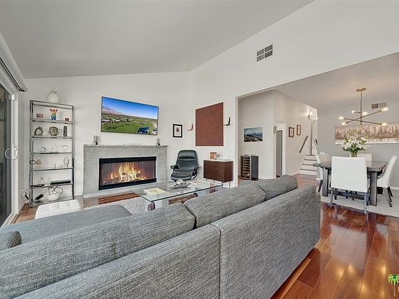 Welcome to Canyon Villas, a desirable South Palm Springs gated community on "land you own". This contemporary townhome has been remodeled with attention to detail. Vaulted ceilings and walls of glass feature 2 bedrooms and 2 bathrooms with 1 bedroom down. The premier location of Unit #8 at the rear of the community has privacy as well as site-lines to both east and west mountain views. Amenities include: dual pane windows/sliders, designer fireplace, custom fabricated railings, George Novak lighting, wood flooring, remodeled/updated kitchen & baths, electric blinds, recently installed Samsung appliances, recirculating pump, water filtration system, low voltage exterior lighting on photocell and more! The grounds are lovingly maintained with variety of mature citrus for your "picking." The HOA includes earthquake insurance, basic cable, water and garbage services. Welcome home!