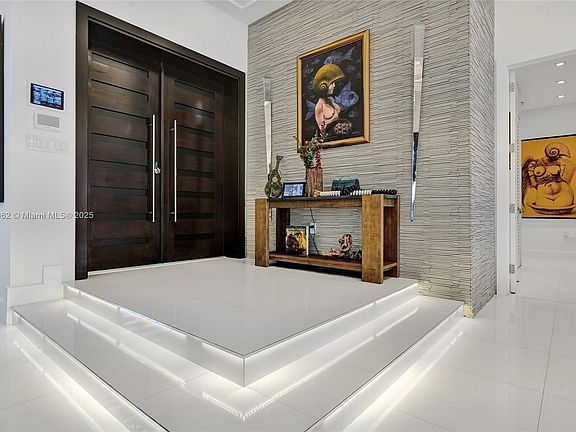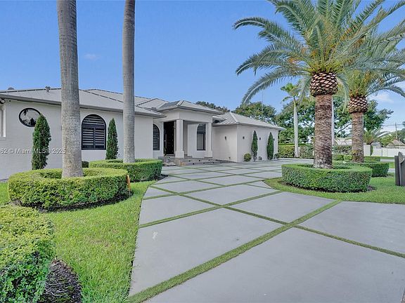 Fully renovated modern home blending luxury style, elegant design, and advanced engineering. This one-story residence offers porcelain floors throughout, hardwood in bedrooms, spacious family and dining rooms, plus a formal living area. Gourmet kitchen with Sub-Zero/Wolf appliances and granite countertops opens to expansive entertaining spaces. Master suite features his/hers walk-in closets, dual sinks, and large shower with dual rainfall heads. Resort-style patio with marble pool deck, Jacuzzi, covered terraces, summer kitchen, and guesthouse. Additional highlights include new metal roof, impact windows and doors, powered blinds, circular driveway, and private cul-de-sac location