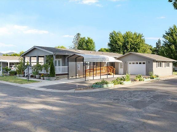 Exceptional 2015 Golden West manufactured home in desirable 55+ Weldon Park! This extremely well-cared-for 1,458 sq ft, 3BR/2BA gem sits on a premium corner lot with attractive green space frontage. Conveniently located with easy access to all of Medford's shopping, dining, healthcare, & recreational amenities, this home has many stand out features that include a detached garage PLUS new large carport for vehicle protection - one of only 3 homes with garages in the entire park! Inside you'll find tons of storage throughout. Established landscaping is dialed in with new drip system-a true oasis featuring new fencing, plantings that flower throughout the year, multiple fruit trees, & several raised garden beds perfect for the gardening enthusiast. A lovely covered front deck/patio & window awnings provide effortless outdoor comfort. Enjoy the benefits of low space rent in this well-established community. Upgrades & improvements throughout - contact listing agent for the complete list.