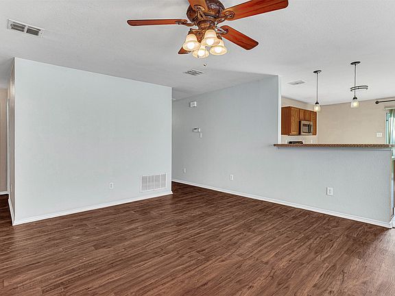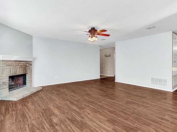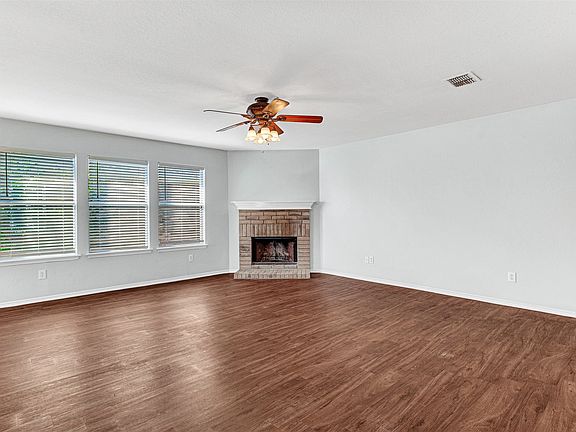 Brick fireplaceSplit floor planWooden floorsLarge kitchenHuge pantry-utility roomTile in bathrooms