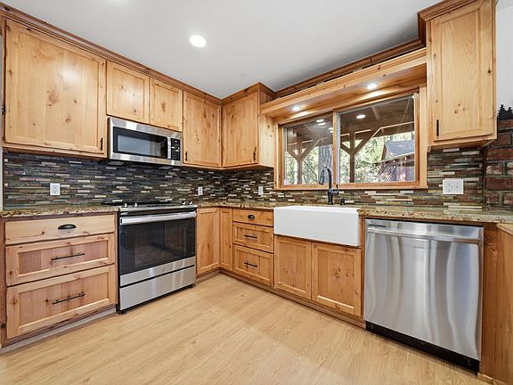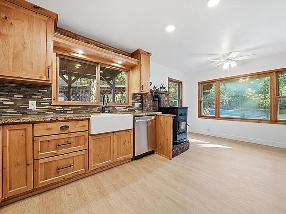 Discover the perfect blend of comfort, craftsmanship, and natural beauty in this charming mountain retreat. Filled with pride of ownership and thoughtful upgrades throughout, this home is truly move-in ready. Step inside to an inviting open and bright main level featuring a bedroom and full bathroom, recessed lighting, and beautifully encased natural wood-framed windows that bring the outdoors in. Gorgeous natural rock fireplace anchors the living room, adding warmth and rustic mountain charm. The upgraded kitchen shines with granite countertops, a tile backsplash, and new stainless appliances including a refrigerator, dishwasher, oven, built in microwave, farm house sink and pellet stove offers warmth and coziness to the kitchen. Enjoy peaceful mornings and tranquil evenings on the large deck overlooking mature trees and untouched nature the ideal setting for relaxing or entertaining. The property delivers exceptional functionality with a 24x24 garage, 8x16 carport, and an additional storage shed, providing ample space for vehicles, tools, and gear. The unfinished basement adds 706 sq ft of potential to expand your living area, whether you envision additional storage, workshop, or guest quarters. On a corner lot with potential of extra space for RV or boat storage.