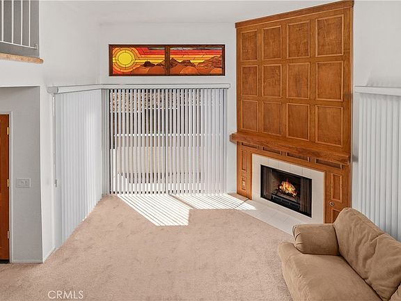 Inside, soaring vaulted ceilings, fresh interior paint, and plush carpet create a warm, inviting atmosphere. The living area offers a cozy fireplace with a custom wood mantle and paneling, accented by a new wood handrail. The updated kitchen features painted cabinets with new hinges, a new faucet and garbage disposal, and sleek large-format tile flooring. Bathrooms have been remodeled, and the primary suite includes its own private bathroom.