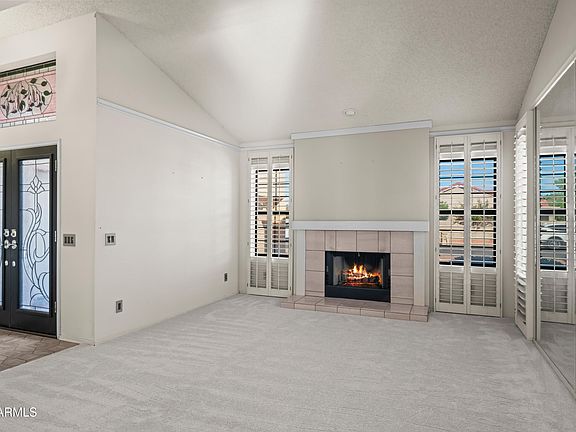 One of the best lake lots in Sun Lakes is finally available! Wait until you see the view you get to wake up to! Exceptional outdoor area to enjoy this peaceful setting includes extended covered patio area with built in BBQ, spa and water fountain. Inside, the formal living room has a fireplace and plantation shutters on all windows. The kitchen has all stainless steel appliances and includes the refrigerator which is just over a year old  Primary bedroom has lake view, two walk-in closets and private access to the back patio.. Walk-in double head shower in primary bathroom in addition to the two vanities. The 2.5 car garage has space for golf cart, built in workbench, storage and removable, custom tile flooring. New carpet throughout. Roof replaced in 2023 and HVAC replaced in 2021