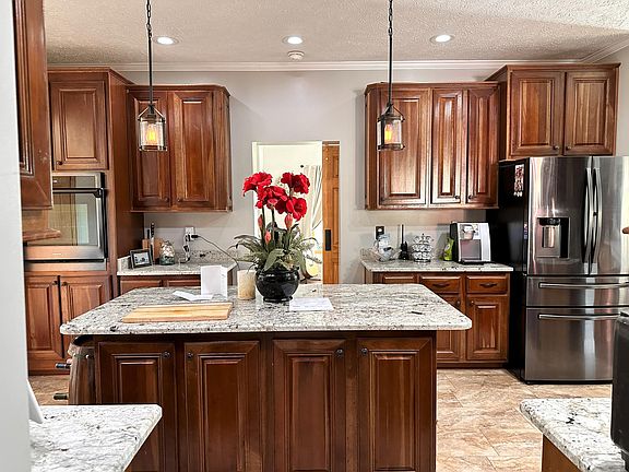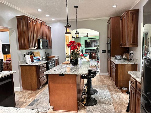 This expansive house offers nine rooms and spans 2,092 square feet. The property is thoughtfully updated with numerous modern amenities and features. With a swim spa, hot tub, heated bathroom floors, whole-home generator, new flooring, new roof, new siding, and a new heating system, it provides practical comforts for everyday living. Two detached garages also offer ample storage and parking space The kitchen, a highlight of the home, is large and includes a center island with granite countertops. It is equipped with a stove and wall oven, and there's a bar area with seating that looks into the kitchen. Cherry cabinets add a warm touch to this functional space. The master bedroom has doors leading to the back deck and hot tub, offering easy access to outdoor relaxation. The modern bathroom features a walk-in shower and a soaker tub for added luxury.