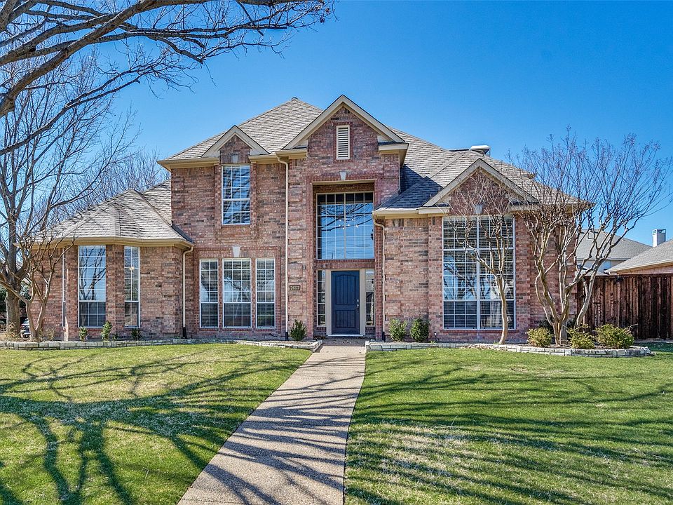 Beautifully maintained home on a quiet corner cul-de-sac lot! Flowing floor plan highlights spacious rooms, wood floors and pool views. Formal living and dining rooms flank the foyer leading to gourmet kitchen featuring GE Profile appliances and quartz countertops. Breakfast connects to family room featuring gas fireplace, built-ins, wet bar and windows overlooking the pool! Two downstairs bedrooms - master and secondary (would also make a great office) with two full baths. Roomy master suite is downstairs with a massive and recently renovated bathroom and walk-in closet. Upstairs is a game room, 3 bedrooms, and 2 full baths. Large screened-in patio and sparkling pool provide the backdrop to many fun gatherings with friends and family. Attached two-car garage, plus a separate one-car garage create tons of storage space. Close to shopping, dining, and walking paths, this West Plano home can't be beat!