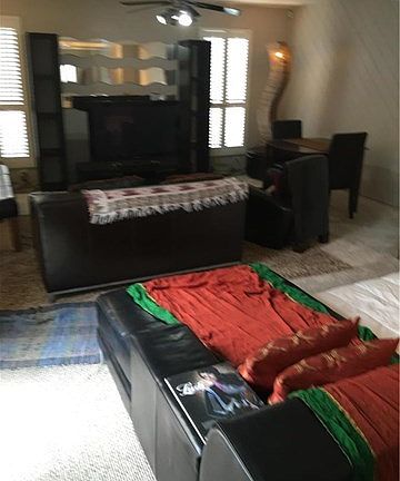 Beautiful custom home features oversize living room/dining room combo with partially mirrored real Cherry Wood Flooring !!! Off the living room area is a third bath room with a shower !!. Kitchen has been recently upgraded with stone flooring garbage disposal and faucet fixtures. Counter top stove,Garden window, dishwasher and fridge included.Individual laundry (washer/dryer not included) Family room with wet bar area , plush carpet and plantation shutters. Second bedroom is carpeted as well with mirrored sliding doors. Throughout the home are new modern track lights , other high end light fixtures and ceiling fan. Customized Interior master closet with matching additional exterior custom storage area - both with mirrored doors and Cherry Wood floor. Main hallway between the two bedrooms floor is Cork. Master bath has a deep tub, second bath houses a shower. Between master bath and bedroom is a vanity area (currently used as a small office) with an extra big walk-closet. Beautiful added attraction is a middle of the house lovely garden Atrium with either sliding doors or custom window allowing views from almost every angle of this lovely home. Exterior of home has a cemented patio area, covered parking for three cars and a storage shed.