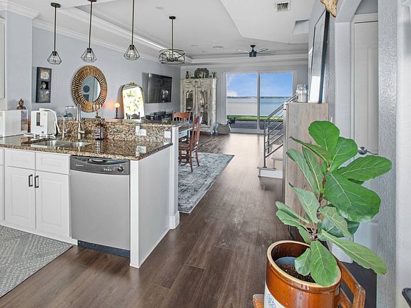 Imagine ending your day on your own private, covered balcony, sipping your favorite beverage while colorful sunset skies reflect over Lake Jackson and the water glows. That's everyday life in this warm and welcoming 3BR/2.5BA townhome tucked into a quiet 3-unit community with just $150/month dues-your slice of paradise on one of Sebring's most loved lakes. Step inside to an open living and dining area with tray ceilings, updated flooring and a modern metal staircase that gives the home a stylish, loft-like feel. The kitchen is bright and functional with white cabinets, granite counters, a breakfast bar and plentiful cabinet storage, plus a pantry and an additional storage closet that also provides access to under-stair storage-offering much more space than you'd expect in a townhome. Newer range and microwave complete the package. A new impact sliding glass door frames the lake and opens onto a covered paver lanai that extends your living and entertaining space outdoors, creating a comfortable spot to relax, dine or unwind while taking in the lake views. Upstairs, the owner's suite is located on the second floor and features its own private, covered balcony with stunning, colorful sunset views over Lake Jackson-the perfect spot for an evening glass of wine or relaxing nightcap. The suite also offers a walk-in closet, while two additional bedrooms and two linen closets provide extra storage. The baths have seen partial updates, including a newer vanity and toilet in the downstairs half bath and a newer vanity in the owner's suite bath, leaving plenty of opportunity for you to finish them to your personal taste. Major items have been thoughtfully updated, including the roof, tankless hot water heater, impact slider, flooring, stairs, railing, lighting and bedroom carpet. Thoughtful extras include a Tesla charger, Kangan Leveluk K8 and Multipure Aquaperform water systems, stacked washer/dryer, and all that enhanced storage throughout the home. Outside, enjoy the shared courtyard and community Composite decking (Trex-style) on the dock that features a covered shore-end pavilion (approx. 15' x 27') with seating area, plus a step-down main pier reaching about 107' into Lake Jackson, with electric service at the dock and designated mooring space for up to two vessels per unit. Best of all, you're living lakefront in paradise and still only about an 18-minute walk to downtown Sebring and the Sebring Circle, which was featured on HGTV's Hometown Takeover with its charming shops, restaurants and community events.