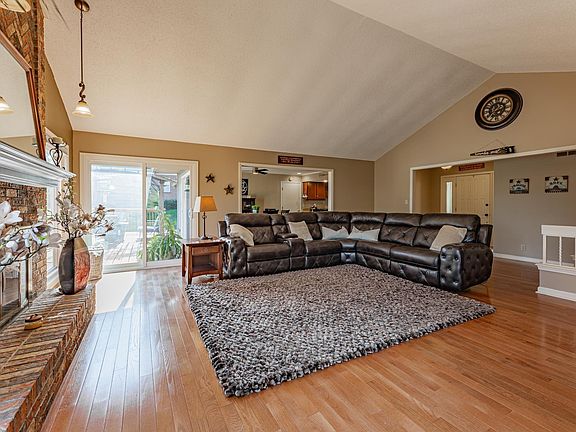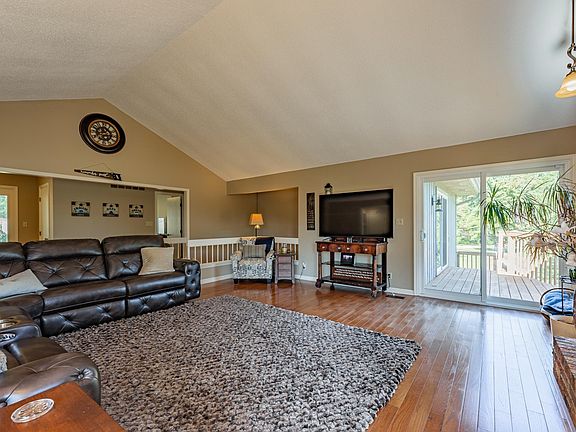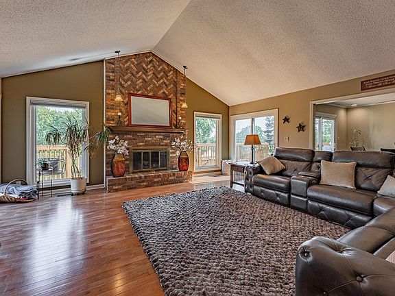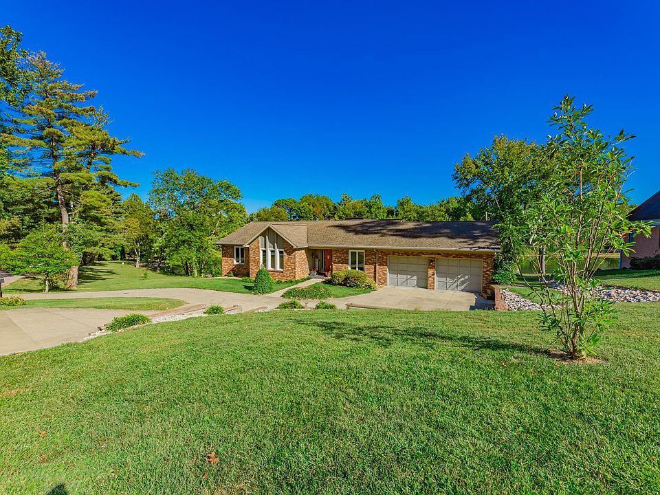 LAKEFRONT brick 3 bedroom, 3 bathroom ranch with attached 2.5 car garage, finished walkout basement, decking across the back overlooking the beautiful lake and inground pool with diving board. This home sits on .75 acres and offers a semi-circular drive. The entry foyer opens to a large living room with hardwood floors, vaulted ceiling, fireplace. Views of the lake from the living room, dining room, kitchen, owner's suite and basement great room. Each room across the back also has sliding doors to the deck. The kitchen and dining room are open to the living room and offers a bar area with additional seating, quartz counters and all appliances included. 2 bedrooms on the main floor with 2 bathrooms. One bathroom is remodeled with soaking tub while the owner's suite has a newer custom walk-in shower. 3rd bedroom and full 3rd bathroom are downstairs. Also downstairs is a great room with fireplace, sliding doors leading to the pool deck, kitchenette area with bar, laundry room and huge 27x12 storage room with built-in shelving and exterior door leading to the pool deck. Next to the lake, there's a private deck with a fire pit area. No outlet street. Seller offers a home buyer's warranty for buyer's peace of mind.