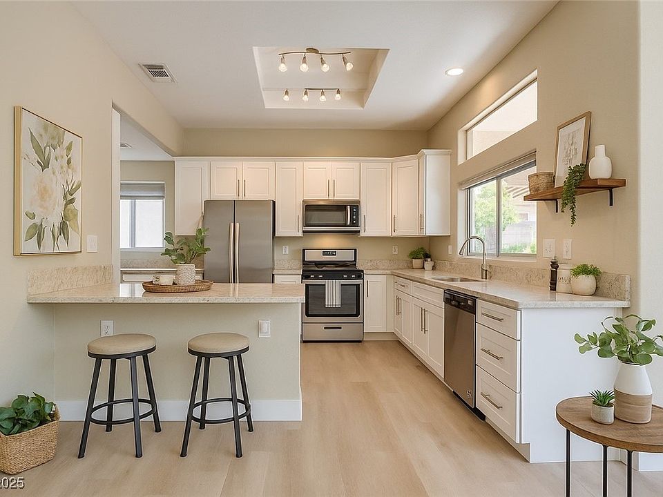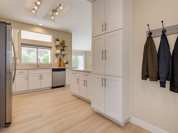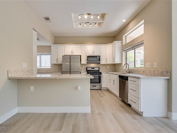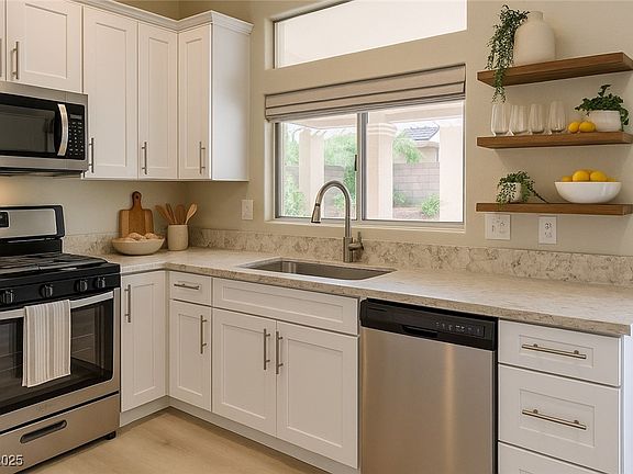 Step inside this light-filled, open-concept home where vaulted ceilings and brand-new wood-look flooring create an airy, modern vibe from the moment you walk in. At the heart of the home is the show-stopping, fully remodeled kitchen featuring white shaker cabinets that provide abundant storage, paired with sleek counters, and stainless steel appliances. This kitchen is perfect for everyday living or entertaining guests, all while flowing seamlessly into the spacious living/dining areas.The split-bedroom layout offers privacy, with the primary featuring a bay window and a spa-inspired bath complete with an oversized walk-in shower. The secondary bedroom sits on the opposite side of the home, adjacent to a fully updated guest bath.Outside, enjoy a low-maintenance backyard with a covered patio. Located in the vibrant Sun City Summerlin community, you’ll have access to four resort-style recreation centers, golf courses, trails, restaurants, clubs, and endless entertainment.