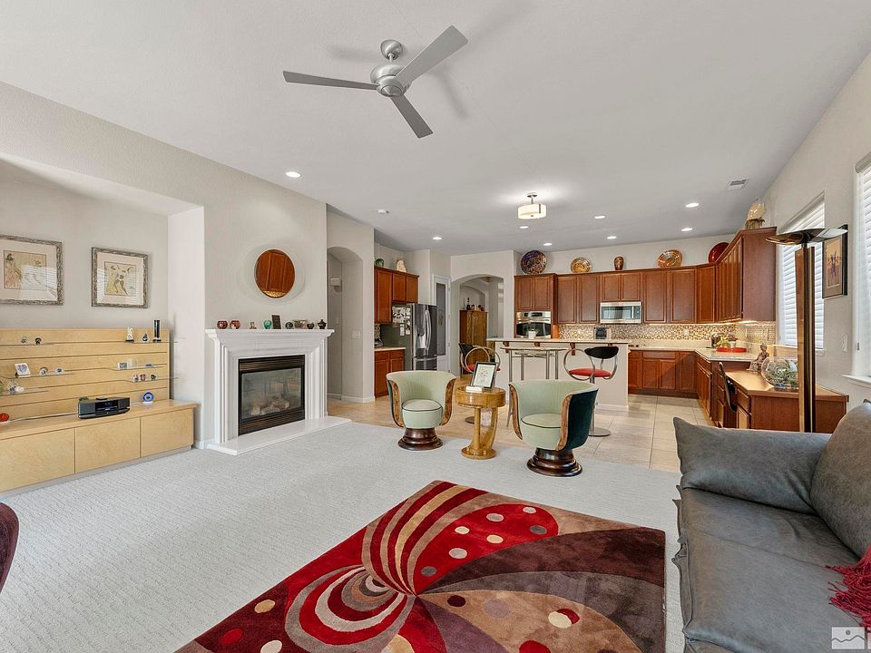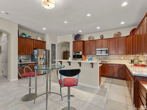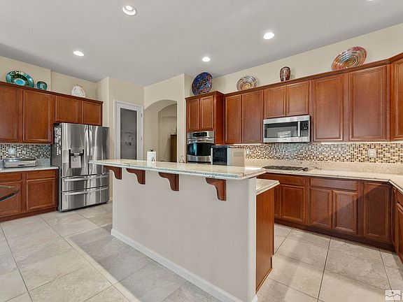 Located in the peaceful neighborhood of Golden Hills community in Damonte South Reno, this tranquil, stunning single level features high ceilings, upgraded cabinets, granite counters with backsplash, gas stove top, double oven, plenty of natural light, neutral two-tone paint throughout, with an expansive open floor plan & a welcoming custom tiled entry. With 2191 sqr feet, this immaculate, bright & airy home will leave you speechless as you walk through the door, feeling like you've entered a model home., You will find tons of upgrades in this bright spacious home including light fixtures, full rain gutters, stainless steel appliances, pantry, breakfast bar, plenty of cabinet storage, plus extended cabinetry in the kitchen to be used for a buffet, desk or workstation. The extra room in the front of the house allows for an office, play room, library, sitting room or gym, while the formal dinning room offers an intimate atmosphere to host family and friends. The main full bathroom is spacious with double sinks and ample counter space. Upgraded laundry room with abundant storage and a washroom sink allowing for hassle free hand washing or spot cleaning. The large and lavish primary suite is separated from the other bedrooms offering privacy and seclusion. The huge walk-in closet, garden tub, dual sinks and shower stall complete the ensuite. On a corner lot, with a lush and low maintenance matured landscape, the paved patio is perfectly situated to provide afternoon shade for you to enjoy your new home. Striking sunrises over the mountain views, incredible sunsets in the distance, close to schools, shopping, walking paths, neighborhood parks and BLM land - this home has it all.