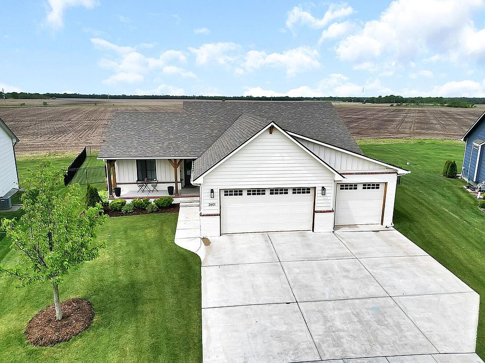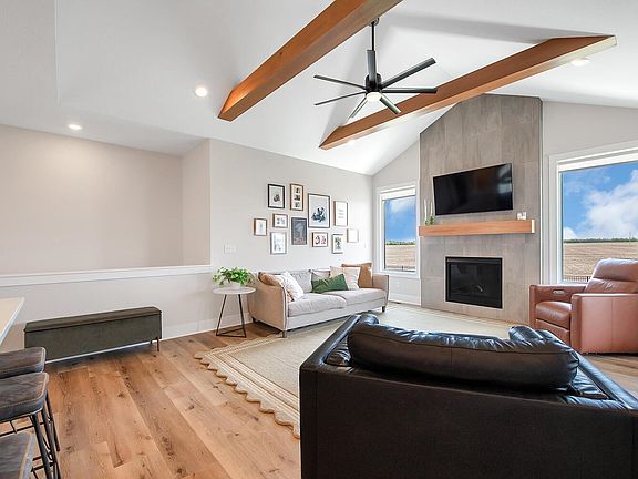 Welcome to this stunning contemporary ranch home located in the popular Cornerstone neighborhood, offering a community pool, playground, and walking-distance convenience to Martin Elementary School. This spacious 4-bedroom, 3-bathroom home perfectly blends modern style and everyday functionality. Step inside to beautiful wood floors and a bright, open layout. The open kitchen boasts an oversized island with quartz countertops, stainless steel appliances, and stylish finishes throughout. The primary bedroom impresses with a vaulted, beamed ceiling and spa-like ensuite featuring a double quartz vanity, open shelving, a sleek matte black frameless fixed glass shower, a private water closet, and a walk-in closet that conveniently connects to the laundry room, complete with a mud bench and storage cubbies. Secondary bedrooms are thoughtfully designed—Bedroom 2 features a double-door closet and ceiling fan, while Bedroom 3 offers charming classic shaker wainscot paneling and a ceiling fan. The nearby bath includes quartz counters, a tub/shower combo, and tile flooring. The inviting living room centers around a stunning floor-to-ceiling tile gas fireplace, accented by beamed ceilings and sun-drenched windows. Downstairs, the expansive Rec Room is a true showstopper, featuring a board and batten accent wall and a fabulous wet bar with floating shelves and quartz countertops—perfect for entertaining. The basement is completed by an additional bedroom with a walk-in closet, a full bathroom, and a large storage room. Enjoy outdoor living on the large covered deck, overlooking a fully fenced backyard with a sprinkler system fed by a private well to keep the lawn lush and green. This home has it all—space, style, and the perfect neighborhood setting. Don’t miss your chance to make it yours!