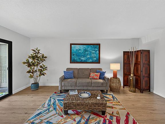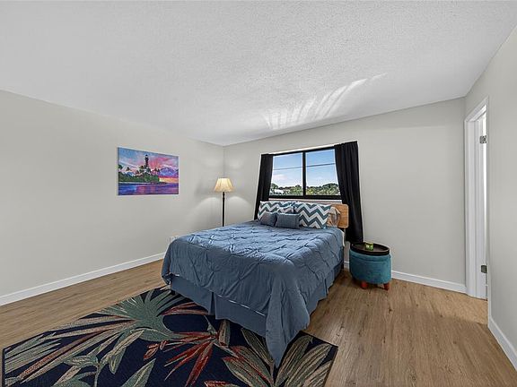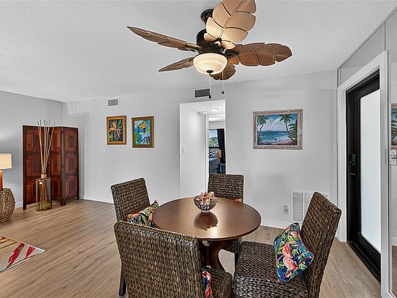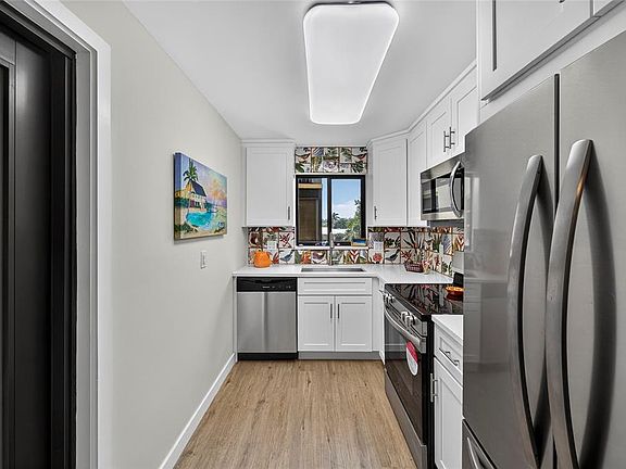 JUST REDUCED $10,000!!! This beautifully renovated 1BR/1.5BA condo is just waiting for you. Kitchen updates include new wood cabinets, quartz countertops, stainless appliances, tile backsplash. Luxury Vinyl plank flooring throughout. Fresh paint throughout. Impact windows and doors. New A/C & HWH. Screened balcony overlooks the beautifully maintained grounds and pool and fountain feature. No pending assessments and passed the milestone. New roof 2023. Amenities include heated pool, clubhouse, putting green, room and more. Close to the beach, shopping, restaurants, golf, etc.