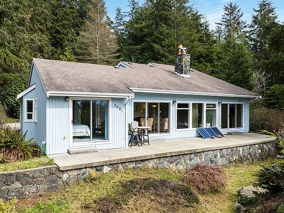 OCEAN & OLYMPIC MTN VIEWS! Inspired 3 bed, 2 bath, 2032sf rancher w/bsmt on a sunny, sw-facing, beautifully treed & landscaped .98ac/42,689sf lot w/trails meandering thru the forest, fenced gardens & stream w/waterfall. Step thru the front door to the cathedral entry w/slate floors. Your gaze will be drawn to the uplifting views & gleaming oak floors awash in light thru a profusion of windows, enhanced by airy 17' vaulted ceilings. Living rm w/floor-ceiling granite fireplace opens thru sliders to the 569sf front view patio. Kitchen w/updated appliances & plenty of cabinetry/counter space + pantry. Dining rm w/Jotul woodstove is ideal for family dinners + bkfast nook w/forest views. 3 bedrooms incl primary w/walk-in closet & 4pc ensuite. 4pc main bath & laundry/mud rm. Down: large family rm & crawlspace for storage. BONUS: can be purchased furnished for turnkey move-in or rental! DBL garage/lots of parking. Live where the wilderness meets the sea & enjoy the finest in West Coast living!