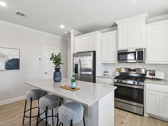 CORNER LOT! HEB ISD! LOCATION, LOCATION, LOCATION!! Beautiful 3-bedroom, 2.5-bath home situated on a desirable corner lot in the new phase of Lakes of River Trails, located within the highly acclaimed HEB ISD! Enjoy charming curb appeal with a spacious covered front porch before stepping inside to an inviting open-concept layout featuring wood-look flooring throughout the entire main level, crown molding, and recessed lighting. The kitchen sits at the heart of the home, offering a large center island with breakfast bar, stunning quartz countertops, stainless steel appliances, a stylish backsplash, and a deep single-basin sink. Upstairs you’ll find all bedrooms plus a convenient laundry room. The primary suite boasts soaring vaulted ceilings, a generous walk-in closet, and a spa-like bath with a large standalone shower. Both secondary bedrooms also feature walk-in closets. A perfect blend of modern design, comfort, and function in a highly sought-after community!