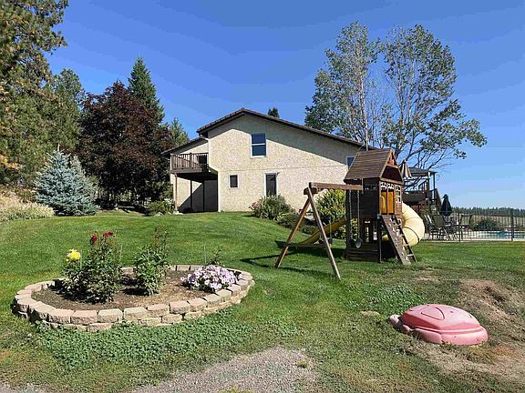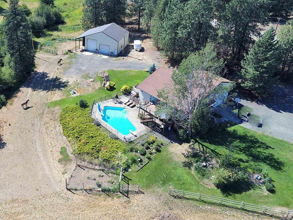Desirable Mead School District this beautiful 3 bedroom, 3 bath home is waiting for you. Enjoy your 9.4 acre (MOL) oasis away from the city that includes an in-ground pool plus a year around creek. Wonderful deck to relax and take in the sunrises or watch the wildlife. The kitchen has granite counters, cupboards galore, pantry and eating bar. There are 3 bedrooms plus an office, and the primary bedroom suite offers a full bath with double sinks, jetted tub, double closets, and slider access to a sitting deck. Access to the pool and patio from walk-out basement with its own fireplace and additional storage room. Hardwood floors, garden area, beautifully landscaped grounds, furnace new in 2018, 40X40 shop/barn with lean to, great well. Room for the children to explore, horses, cattle, sheep, or goats. Within minutes of Wandermere and all the amenities.