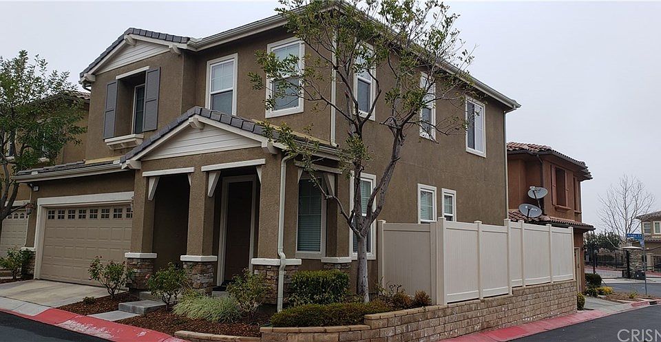Highly upgraded and Immaculate detached house with 3 bedroom and 2.5 bathrooms on the corner lot in the desirable gated Milestone community. This gorgeous home has lots of amenities such as bright and light open floor plan, spacious living room with media niche and upgraded pebbled fireplace with mantel, large kitchen with granite counter top with full backsplash, stainless steel appliances, and upgraded cabinets opened to large dining room. Master bedroom suite with walk-in closet and Master bathroom with double sinks, bathtub and separate shower stall. 2nd bedroom has bamboo hardwood and mirrored sliding closet door. Recessed lighting, custom paint, mini blinds, and convenient laundry room upstairs. Do not miss the covered patio cover and built-in BBQ in the private and bricked backyard. Very convenient location close to community pool, schools, park, shopping centers and freeway. Run and run, this Santa Clarita Valley gem will not last long. Absolutely must-see!