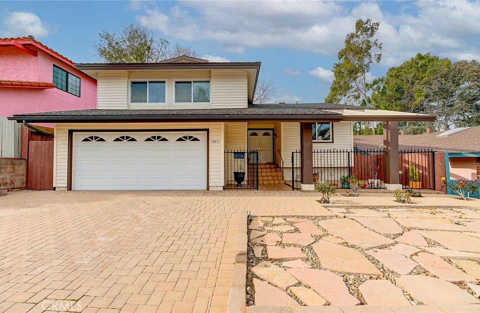 Beautiful, tri-level home located on an elevated cul-de-sac with city views! Well maintained exterior with protective siding, decorative soffit and new roof. Pavers line the driveway to a two-car attached garage. Gated front entrance and low maintenance front yard. The foyer leads to the formal living room with large windows and fireplace. Kitchen hosts a bay window and seating area. Upstairs is a total of three bedrooms and two baths including a main bedroom and en suite bathroom with generous closet space. Head downstairs to the family room plus an additional bedroom and bathroom. Family room slider opens up to a private backyard to enjoy outdoor living year-round. Bottom level has access to the garage which has been converted to a bar area to host parties. Washer and dryer also enclosed in garage. Conveniently located near beach, shopping, restaurants and the 110 freeway. Come check out this gem for yourself!