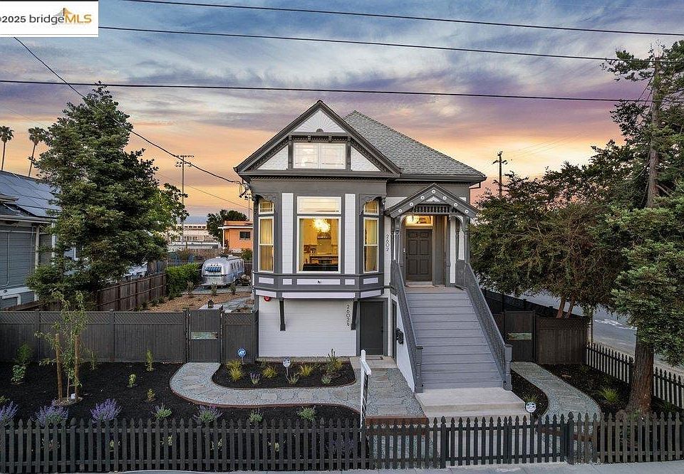 NEW PRICE! Where Victorian artistry meets modern sustainability, 2602 Adeline Street is a rare West Oakland property with the makings of an extraordinary compound. The main residence, equipped with solar, is a gorgeously reimagined two-story home featuring an open-concept kitchen, dining, and living room, two sunlit bedrooms with soaring ceilings, and 1.5 stylish baths downstairs. Upstairs, two architecturally striking rooms and an additional 1.5 baths include a flexible retreat—fabulous 4th bedroom or lounge—with wet bar, sitting areas, and a balcony with views of the Town and Hills. Outdoors, a parklike yard showcases mature redwoods, garden beds, and multiple sitting areas in West Oakland’s coveted microclimate, ideal for fruit trees and outdoor dining. Beyond the home lies compound potential: a fully restored 1982 Airstream in final stages of permitting as a dwelling, a huge detached garage/workshop with EV charger, and a lower unit with French doors and new foundation—ready for build-out as guest space, studio, or flex-use. A blend of history, design, and versatility, 2602 Adeline is a property like no other.