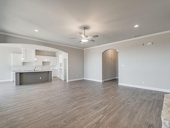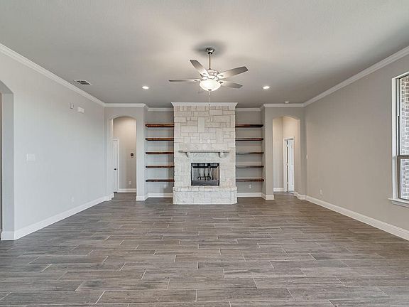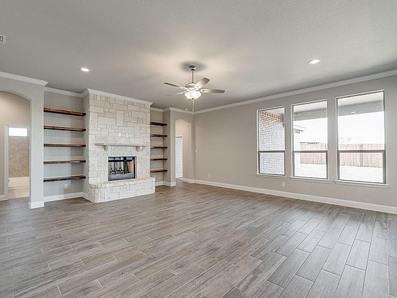 STUNNING GLACIER CUSTOM HOME. Gourmet kitchen open to huge family room. SS appliances, oversized eat at island. Large walk in pantry, tons of custom built cabinets with granite counter tops, upgrade WOOD LOOK floor tile, 3x6 subway tile backsplash. Gorgeous wood look tile floors in foyer, family room, kitchen and hallways. Handsome floor to ceiling stone fireplace with built in book shelves on either side. Crown molding in foyer, study family room and master bedroom. Spacious separate utility room with lots of custom cabinets for storage. Large covered patio with east facing back yard. *Insulated overhead garage door with opener. Smart Home Package with programmable lighting, enhanced wifi booster,