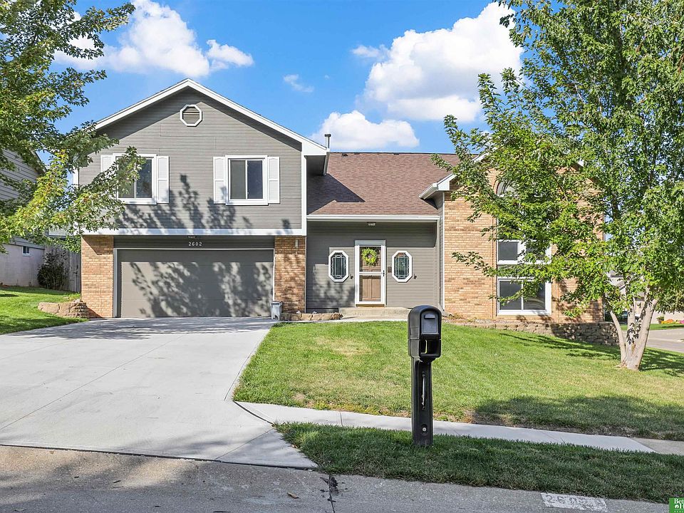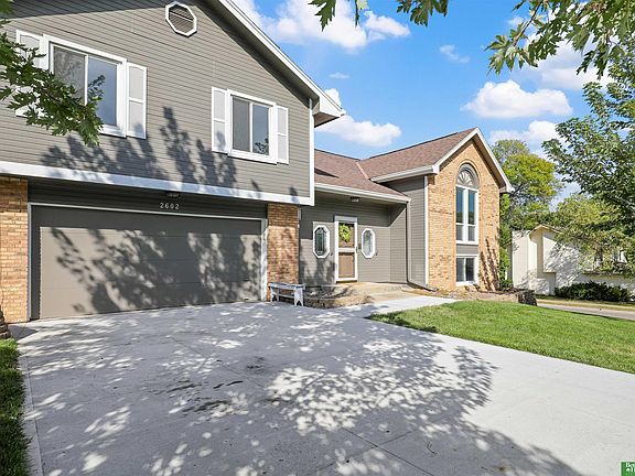 Multi-level home sitting on a corner lot just minutes from Offutt AFB, parks and trails, playgrounds, and Kennedy Freeway which gets you quickly to the heart of Omaha! Home recently received exterior siding updates and fresh paint with an eye-catching color, a brand new south-facing driveway (quick snow melt!) leading to a 2 car garage, and all new interior paint. Main level features spacious living room, vaulted ceilings with wood beams, brick fireplace, and a beautiful south-facing windows. Plus - whole home is carpet-free! This unique floorplan has 4 bathrooms, including a primary bedroom en-suite with double sinks. Enjoy a walkout basement with 4th bonus room/dedicated office. Back deck overlooks fully-fenced backyard with 8-zone underground sprinkler sys. Convenient main level laundry (washer/dryer included!) Vinyl windows '10, dishwasher <1 yr old, granite kitchen counters, and more.