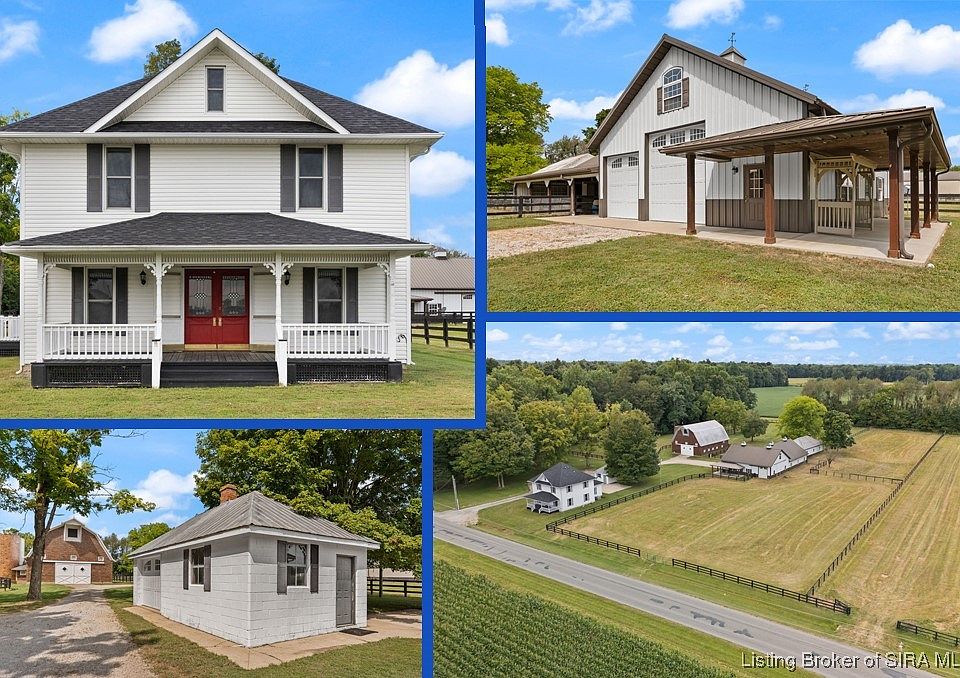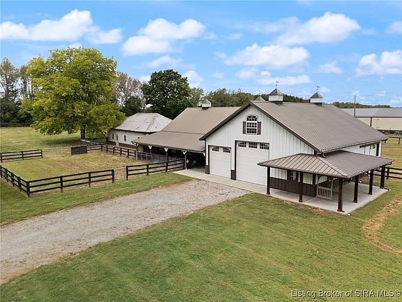 WHERE ARE ALL THE HORSE PEOPLE??? This one is a gem!! Beautiful home, fabulous horse facilities on approx 5 acres with potential for special events venue in spectacular BICENTENNIAL BARN!! Completely updated 2-story home with 3 BR, 2 BA features gorgeous hardwood floors in large living and formal dining rooms, beautiful cabinetry with farmhouse sink, granite countertops and stainless appliances, laundry with new washer and dryer, full bath on each level, with one bedroom currently used as an office with built-in cabinetry, fresh paint throughout, new roof in 2023 and detached garage with workshop area. The 5-STALL HEATED HORSE BARN has 2 foaling stalls, hot water wash bay, massive hay loft, feed & tack room with washer and dryer hookups, large overhead garage doors to accommodate RV or equipment/trailer storage and large heated office area with kitchenette, half bath, and WIFI TV opening up to a wraparound porch. 28x50 fully insulated building previously used as a kennel. 40x56 kiln dried block BICENTENNIAL BARN is perfect to host events or provides massive space for multiple uses. 4 fenced pastures with run-in shed and sand base arena. Conveniently located in a quiet rural location with easy access to I-65 and 45 minute commute to LVL metro.