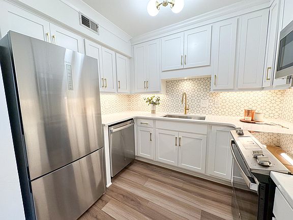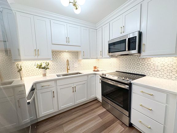 Modern finishesPrivate patioQuartz countertopsNew flooringGorgeous bright new kitchenStainless steel appliances