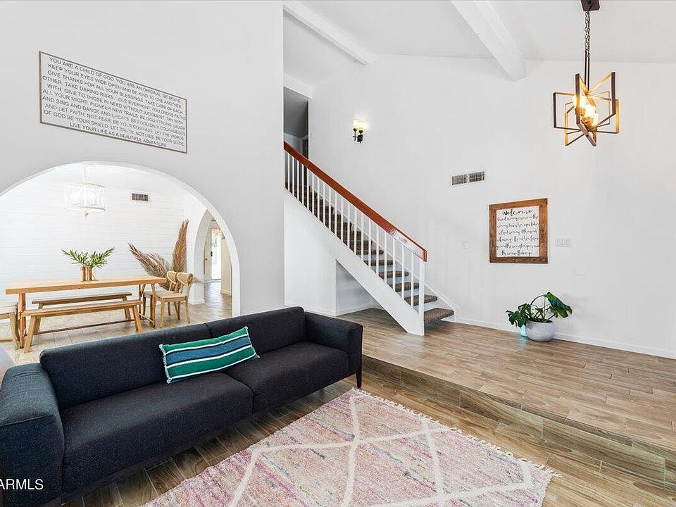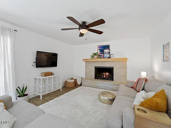 Spacious and charming home that is perfect for the entire family! This remodeled home sits on a HUGE LOT with a fenced diving pool, citrus trees, built-in fire pit, RV gate with a large side lot for parking boats, trailers and more! Step inside of this renovated Dobson Ranch home that opens up to new wood plank tile flooring on the main level, formal dining room with beautiful arched openings and added shiplap wall, refreshed kitchen featuring white cabinetry and open shelving, stainless steel appliances and great flow into the living room with cozy newly refinished fireplace. Remodeled bathrooms, two-toned paint, plantation shutters, built-in storage in the playroom and updated laundry room! Zoned for highly sought after Eagle Ridge enrichment program for Home Schooling!