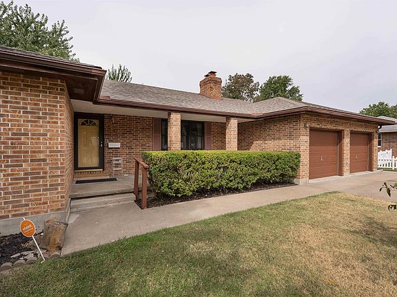 This all-brick 3-bedroom, 2-bath home offers both comfort and convenience in a prime location near Katy Park and Skyline School. The kitchen opens to the dining area and eat-in space, featuring countertop seating, plenty of cabinets, and ample counter space. The primary suite includes a walk-in closet, while the home provides abundant storage throughout. Enjoy relaxing in the sunroom or on the covered front porch. The spacious laundry area adds everyday convenience, and a ramp in the garage can remain or be removed to suit your needs. The basement includes a second fireplace with flooring added this level could be easily finished into additional living space. The storage area is plumbed with a stool. There is a walk-out that is enclosed on the outside.