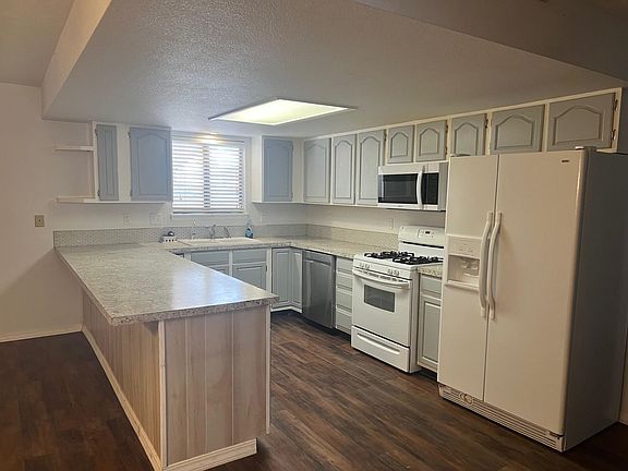 Super nice brick 4 bedroom 2 bath home with a 2 car garage on a corner .350 acre lot. Large workshop/storage building. Nice sized kitchen and dining area. Brick fireplace in the living room to cozy up to on those cooler days and nights. Large Primary bedroom with a nicely remodeled tiled ensuite. Guest bathroom is also remodeled with tile work. Beautiful wood look flooring throughout and plenty of cabinet space in the spacious kitchen. This lovely home has an office as well as 4 bedrooms! Water softener, washer, and dryer stay with the home as well as the appliances. Stay cool under the expansive rear patio overlooking the .35 acre corner lot. Mountain views and trees in the front yard. Call today for a tour!