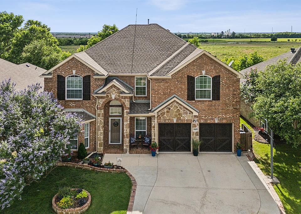 Welcome to this stunning two-story, east-facing home located in Celina, Texas, one of the fastest-growing cities in the USA. This exquisite residence features a spacious open concept design with six bedrooms, three full bathrooms, and a convenient half bathroom. Upon entering, you’ll first notice the elegant formal dining room, perfect for hosting gatherings, while the gorgeous spiral staircase awaits just beyond as a captivating centerpiece of the home. The main floor includes a large open living room with a beautiful fireplace and mantle, kitchen with granite countertops and an island, a breakfast nook, and a master bedroom with an en suite bathroom, providing a serene retreat, along with a dedicated office space that is ideal for remote work or study. Upstairs, you’ll find five additional bedrooms and two full bathrooms. One of the bedrooms features wardrobes on two walls, making it perfect for an office or library, while two others share a thoughtfully designed Jack and Jill restroom. Luxury vinyl flooring flows throughout most of the first floor, enhancing the modern feel. The expansive loft area upstairs offers versatile space for relaxation or recreation, and a flex space conversion (8'x16' approx. 128 additional sqft.) off the garage is fully equipped with electricity, water, and separate heating and cooling, ensuring efficiency. The exterior of the home is equally impressive, showcasing wonderful curb appeal with meticulously maintained landscaping. A covered back patio, complete with a ceiling fan, invites outdoor living, while all exterior woodwork and Hardie board siding have been freshly painted. The garage door and shutters were recently re-stained in May 2025, ensuring a polished look that complements this remarkable property. Close to shopping, elementary school, and Preston Rd. Don't miss this opportunity to own a rare six-bedroom home in Celina!!