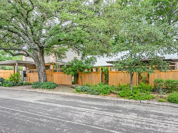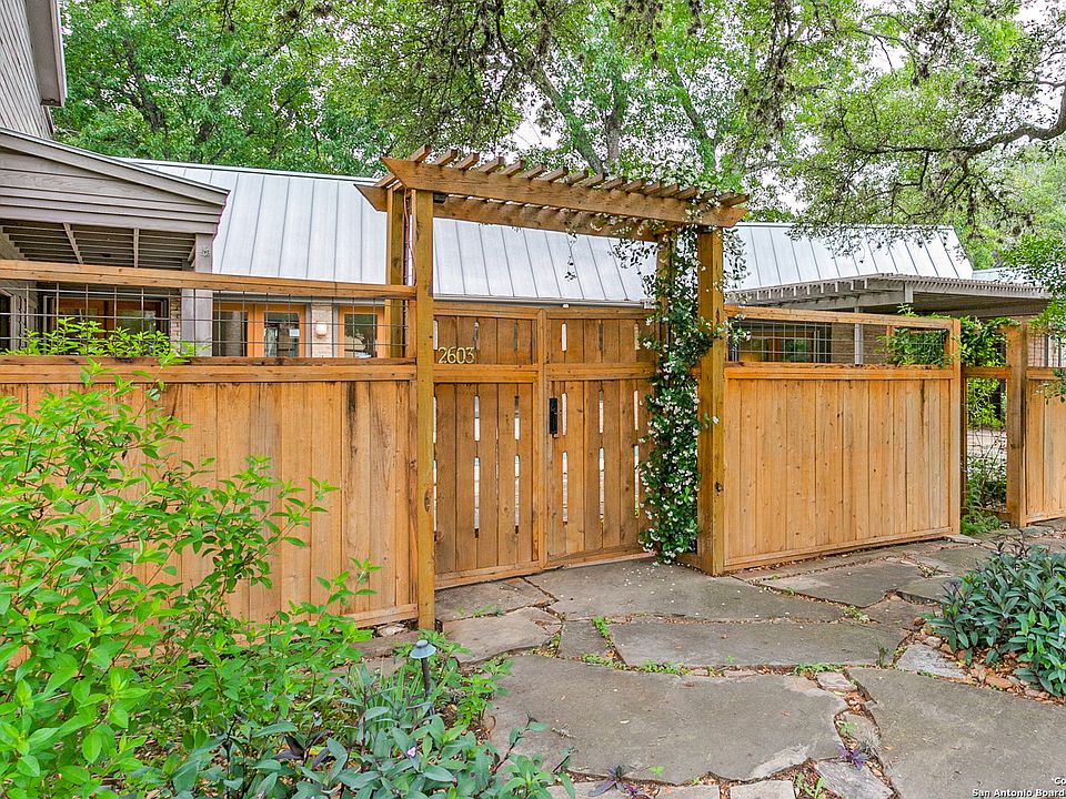This stunning mid-century modern home blends O'Neil Ford-inspired architecture with modern sustainability. A metal roof and solar panels enhance efficiency, while vaulted ceilings with exposed wood beams and walls of windows create a bright, open feel. The private, gated front courtyard features a sparkling pool and surrounding patios. Inside, the open living and dining areas center around a open wet bar, perfect for entertaining. The galley kitchen includes a built-in breakfast bench. With four bedrooms-two downstairs with en suite baths, including the primary-plus two more upstairs, the layout offers flexibility and privacy. The Hill Country-style backyard boasts a sprawling deck, screened-in porch, and a bridge crossing a dry creek bed an expansive back yard with a garden shed / greenhouse. A rare retreat in AHISD-don't miss this opportunity!