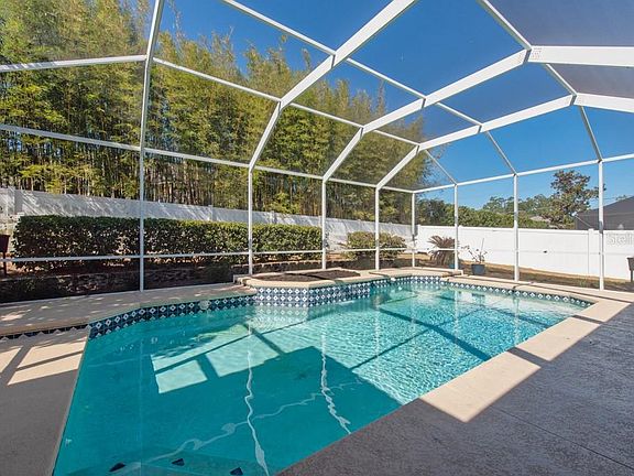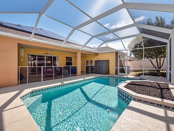 Tucked away in the quiet neighborhood, this Paragon Model home is a rare find among just 56 residences—offering a perfect blend of comfort, privacy, and modern updates. Homes like this don’t come along often, so act quickly to make it yours. This 4-bedroom, 3-bath home has been thoughtfully updated with a long list of brand-new upgrades, including a new roof, new pool pump, new cage screens, new HVAC system, and paid solar panels that keep your electric bills impressively low. The freshly painted exterior adds crisp curb appeal to this move-in-ready gem. Inside, you’ll love the split-bedroom floor plan, creating privacy and flow for both everyday living and entertaining. The oversized primary suite is a true retreat with a walk-in closet, dual vanities, a walk-in shower, and a relaxing soaking tub. A dedicated office and formal dining room offer flexible space for work or gatherings, while the open-concept living and kitchen area serves as the heart of the home. The living room features custom built-ins and soaring ceilings, giving the space an elegant yet inviting feel. The kitchen is both functional and beautiful with Corian countertops, a tile backsplash, a breakfast bar, and pantry storage. A secondary bonus living area provides even more room to spread out—perfect for a playroom, media space, or guest retreat. Step outside to your own private oasis where a screened lanai overlooks the sparkling pool and tranquil backyard—ideal for relaxing afternoons or hosting summer get-togethers. With its impressive list of upgrades, thoughtful layout, and energy-efficient design, this home is a rare find in a sought-after neighborhood. Schedule your showing today before it’s gone!***FREE 1/0 Rate Buy Down when using the seller's preferred lender!***