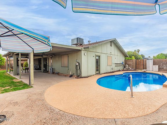 This 3-bedroom residence in Chandler features a desirable NO HOA. The backyard is an entertainer's dream, showcasing a recently extended expansive covered patio with custom-designed concrete, inviting seating areas and a sparkling pool ideal for relaxation. The property's exterior exterior boasts an attractive façade with lush landscaping, 6 car slab parking and a 2-car garage. Inside is warm and inviting with a soothing color scheme. The well-appointed kitchen offers ample storage, a spacious peninsula with breakfast bar, and built-in appliances for a seamless cooking experience.
