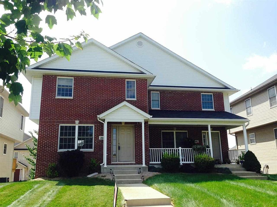 Delightul townhome offers mint condition throughout. It partakes of a lovely view of neighboring green space from the living room or front porch. Friese carpeting, tile floors and laminate add to the appeal. Large living room with bar area overlooking kitchen. Kitchen offers room to dine within and natural maple finish cabinetry. Appliances are included. You will love the oversized garage that offers plenty of storage space that could be finished into an additional living space. Two generous bedrooms--each with its own bath and walk-in closet. Location is tops and only minutes to downtown, 37 or shopping. A must see!