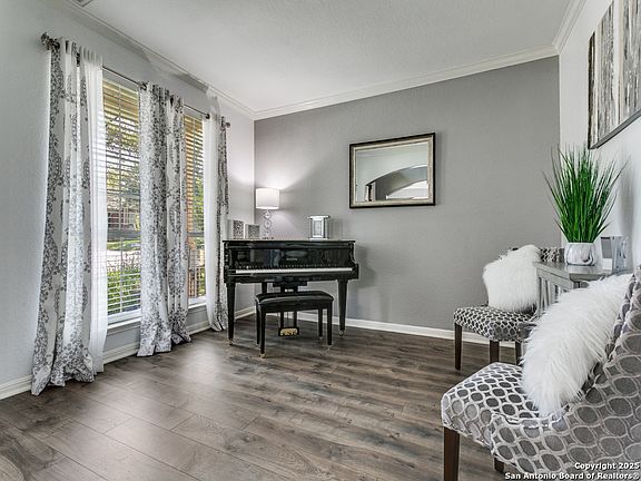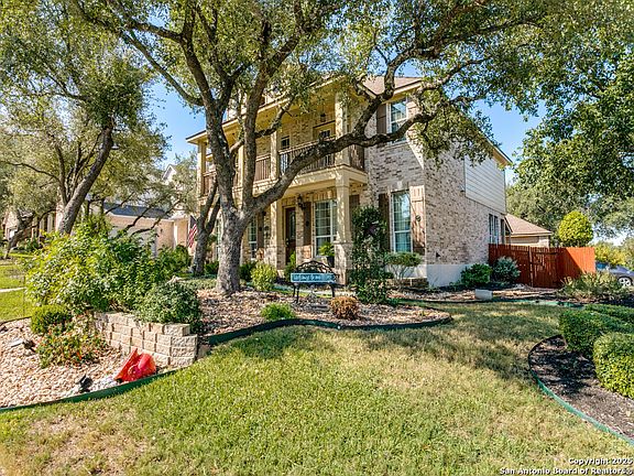 Beautiful Two Story Home in Prestigious Gated Community. Nestled on a tree -covered corner lot, this stunning traditional home offers style, comfort, and convenience. Featuring 4 bedrooms and 3.5 baths, this home showcases an open floor plan with soaring two story ceilings and abundant natural light. The updated kitchen includes gray cabinetry, quartz countertops, and built-in stainless steel appliances-- perfect for everyday living or entertaining. The primary suite is located downstairs and features a spa like bath with a garden tub and separate shower. Upstairs, enjoy a spacious media room ideal for movie nights or play area. No carpet in the main living areas or bedrooms. Step outside to a large balcony and take in the views of the beautiful tree-shaded surroundings. Located in Comal ISD with award winning schools, no city taxes and quick access to Highway 281 and is just minutes from outstanding shopping, dining and entertainment.