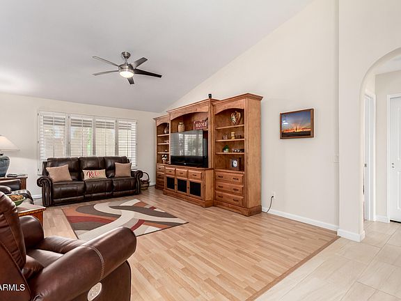 Turnkey Retreat with Resort Amenities! Escape to sunshine and serenity in this beautifully upgraded 2-bedroom, 2-bath ''Palacia'' floor plan—perfect for seasonal living or full-time retirement. Fresh paint, inside and out, and tile floors offer easy care, while rich wood flooring in the living and dining areas adds warmth and charm. The updated kitchen features granite countertops, stainless steel appliances, self-closing cabinets, and a farmhouse sink—ideal for hosting or relaxing at home. Both bathrooms have been tastefully updated with new showers, flooring, and lighting. Custom plantation shutters and walk-in closets in both bedrooms, resurfaced garage and patio, and improved landscaping with citrus trees for a touch of Arizona flavor, and the extended covered patio offers privacy and shade. The home has new energy efficient windows, a new water softener with whole house water filtration, new water heater, and new garage cabinets to provide ample storage. Located in a vibrant, amenity-rich community with golf, tennis, pickleball, pools, fitness center, restaurants, clubs, and endless social activities. Whether you're escaping winter or embracing a new chapter, this home offers the perfect blend of comfort and connection.