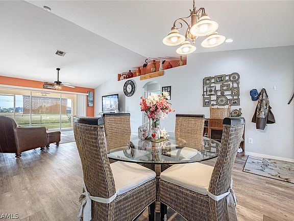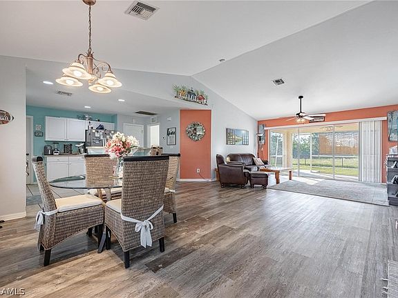 SELLER HAS TO RELOCATE DUE TO BUSINESS OPPORTUNITY AND IS OPEN TO OFFERS! Charming and secluded concrete block 3-bedroom, 2-bathroom home built in 2006 available in Cape Coral! This open-concept home is full of natural light, with soaring high ceilings and is getting a NEW SHINGLE ROOF IN 3-4 WEEKS. The kitchen features stainless steel appliances that are just 3 years old, extra deep double sinks, neutral tile flooring, and white cabinetry. This home has NO carpets to maintain with new vinyl flooring being installed 3 years ago, a new high efficiency HVAC unit being installed 2 years ago, and a new HWH installed 1 year ago. Take in gorgeous sunsets from the western facing screened-in lanai, enjoy bananas from the backyard banana tree, and rest easy letting pets outside with a fully-fenced-in backyard. Furnishings in the home are negotiable! This location is ideal, just minutes away to Publix Super Market, Walmart Supercenter, Lowe’s Home Improvement, Sam’s Club, endless dining options, shopping centers, gas stations, and much more!