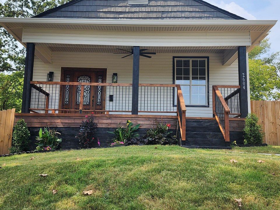 Move In Ready!! Home was taken to the studs and rebuilt. This stunning completely renovated home is combined with elegance and vintage. Located 3 minutes from downtown. The large covered porch is perfect for relaxation. The open floor plan has a LED electric fireplace, Quartz countertops and recess lighting throughout the house. Kitchen features new stainless-steel appliances with an Over-the Range Convection Microwave. Beautiful white custom cabinetry with a Lazy Susan Turntable. Coffee Bar. Refrigerator conveys. The primary bedroom features a walk-in closet, full bathroom with a custom walk-in shower and a door that leads to the back deck to enjoy the beautiful privacy fenced backyard. Storage building conveys. Light fixtures and ceiling fans 2025, Waterproof LVP flooring 2025, Electrical 2025, Plumbing 2025, Water Heater 2025, Gutters 2025, Roof 2025, Sod 2025. This home was built in 1959 but has all the high-end features of a new construction. This beauty will not last long, schedule your private showing today!! See Agent Remarks.