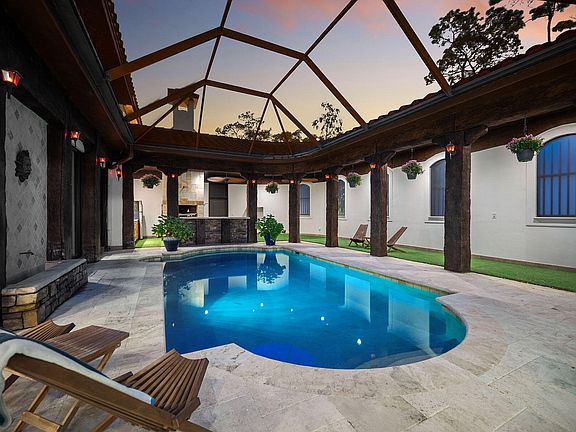 Welcome to your private Naples estate, a secluded and exceptionally unique 1.14-acre compound offering western exposure, unmatched convenience, and a rare multi-residence layout with no HOA restrictions or fees. Ideally located just off Golden Gate Parkway near Livingston, this gated property includes a grand 6-bedroom, 5.5-bath main residence, two separate one-bedroom, one-bath guest apartments with kitchenettes, a standalone gym, and resort-inspired outdoor living centered around an impressive courtyard. A rare, marble-finished driveway joins the private entry gate, impact doors and windows, newer HVAC system, whole-house generator, buried propane tank, and whole-house tankless water heater that delivers endless hot water to introduce the comfort, efficiency, and luxury this estate provides. Inside the main home, marble flooring spans the living areas, with warm wood flooring in the bedrooms and tile in the baths. Custom coffered ceilings, French doors, a fireplace, and a whole-home surround system further elevate the living experience. Four bedrooms sit at the front of the home, while the primary suite and sixth bedroom enjoy a peaceful setting at the rear. Expansive glass doors open to the courtyard, creating seamless indoor-outdoor living ideal for everyday comfort and entertaining. The chef's kitchen is exceptionally well-designed with both gas and electric appliances, granite countertops and backsplash, a stacked-stone accent wall, oversized island with sink, mounted main sink, stainless steel appliances including a gas range with pot filler, wall oven, built-in microwave, refrigerated drawers, wine cooler, refrigerator/freezer, and newer dishwasher. The primary bath offers a built-in massage table, soaking tub, dual sinks with makeup counter, and a luxurious five-showerhead walk-in shower. Two guest bedrooms include en-suite baths, and both a half bath and pool bath serve the main living and courtyard areas. The stunning screened courtyard is designed for year-round enjoyment with a heated pool, turf and travertine surround, and covered outdoor living with ceiling fans. The full outdoor kitchen features an Argentine grill, cooktop and griddle, deep fryer, refrigerator, bar area, and granite counters with matching backsplash—perfect for entertaining on any scale. Beyond the courtyard, the backyard becomes a private park with a peaceful pond, charming bridge, fruit trees, and multiple areas for quiet relaxation. A separate equipment building houses the water system. This exceptional Naples compound offers privacy, versatility, and true resort-style living, creating a rare opportunity for those seeking a one-of-a-kind estate.