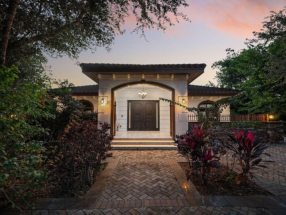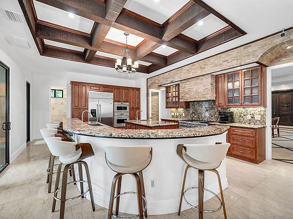 Gated propertyWestern exposureOversized island with sinkMarble-finished drivewayCustom coffered ceilingsFrench doorsWhole-home surround system