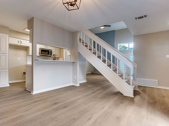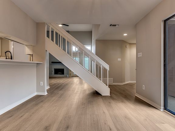 A fresh and clean blank canvas ready for your finishing touches! This 2 bedroom, 2 full bathroom two-story single family home offers a light-filled layout, perfect for creating the low maintenance home you've always envisioned. All new flooring, paint, countertops, light fixtures and more! The space is divided by centrally located staircase. Living room boasts floor to ceiling brick fireplace with accent mantel. The galley kitchen features quartz countertops and slick backsplash with ample cabinet space and breakfast bar connecting Kitchen and dining area. Upstairs Primary bedroom is generously sized, with vaulted ceiling and XL walk-in closet and built-in shelving. En suite bathroom offers dual sinks and glass enclosed shower tub combo. Secondary bedroom located upstairs offers nice sized closet and easy access to the full bath. Bonus built-in desk in loft area allows for plenty of extra storage and workspace! Neutral paint and flooring throughout make it simple to move in and customize to your taste. Outside, enjoy a nice open patio and low maintenance green space.