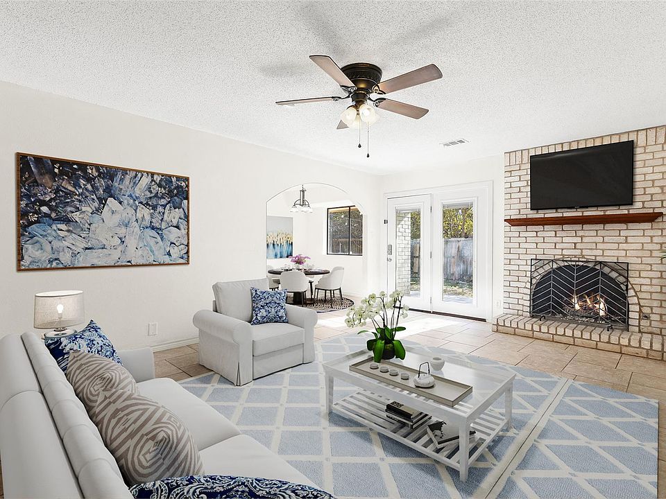 White-brick fireplaceUpdated appliancesGood natural lightCeiling fansSliding barn doorCozy layoutOpen sun-filled spaces