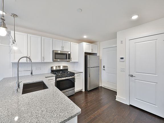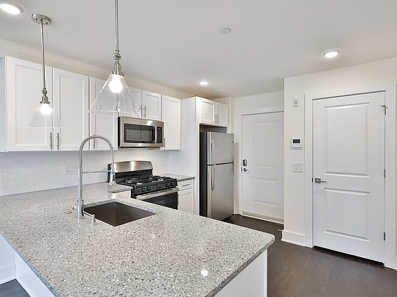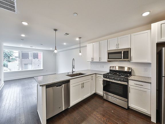 Enter your 2 bedroom, 2 bathroom apartment into your L shaped kitchen that opens into your living area. The kitchen is equipped with modern finishes, full size oven, stove, refrigerator, microwave, dish washer, garbage disposal, deep sink and soft close cabinetry. Off of the kitchen you will find a coat closet/pantry. Head upstairs where you will find the first oversized bedroom and bathroom as well as TWO storage closets. You will also find the washer and dryer on this floor. Continue upstairs to the primary bedroom with en-suite bathroom and TWO closets and a linen closet. Continue upstairs to your own private roof top deck! This apartment spans three floors and is perfect if you prefer the living floors and each bedroom to be on their own level for quiet enjoyment.